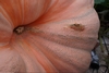 This is a prime example of "tears before breakfast" with shock as the sheet was uncovered in the morning to reveal some odd pustule growth on the pumpkin. There is also some water soaking noticed in the surrounding tissue since it seems the source for the growth is just under the surface of the pumpkin.