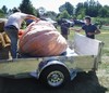 Once some tension is placed on the straps and things seem in order the trailer is brought into position. The goal is to minimize the time the pumpkin spends suspended. The pallet is strategically placed in the trailer over the axle and foam and padding is added to help reduce the chance of damage during the transportation process. This allows alignment of the pumpkin on the pallet to ensure proper balance on the trailer while towing.