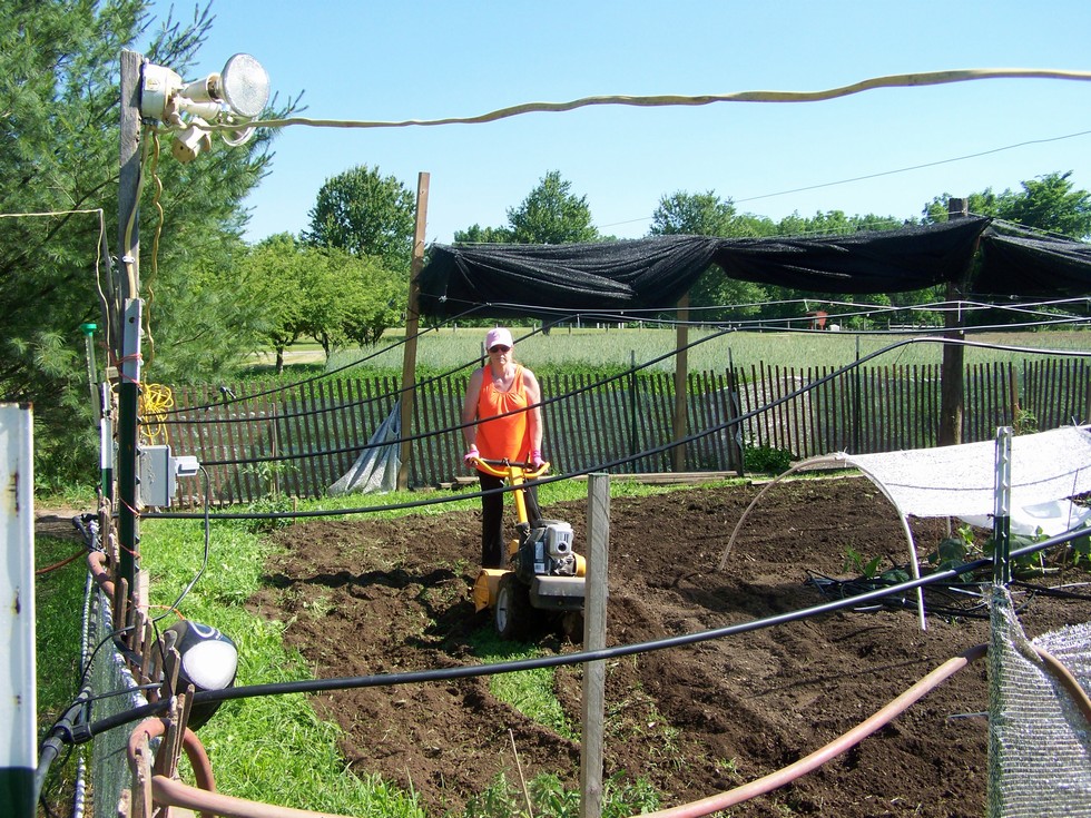 This is a pic of Teresa tilling the cover crop (and amendments) in front of the vine on Saturday. As you can see we only have about 10-12 ft left in a 30 ft patch...what a year so far!
