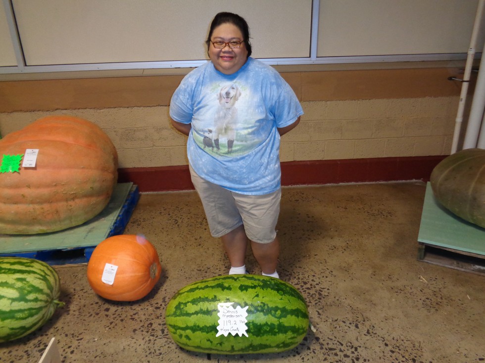Here is Liza standing in front of my little 239 Leonard. She and I will be married soon. I believe this melon would have done very well if I had not over dosed it on forchlorfenuron.