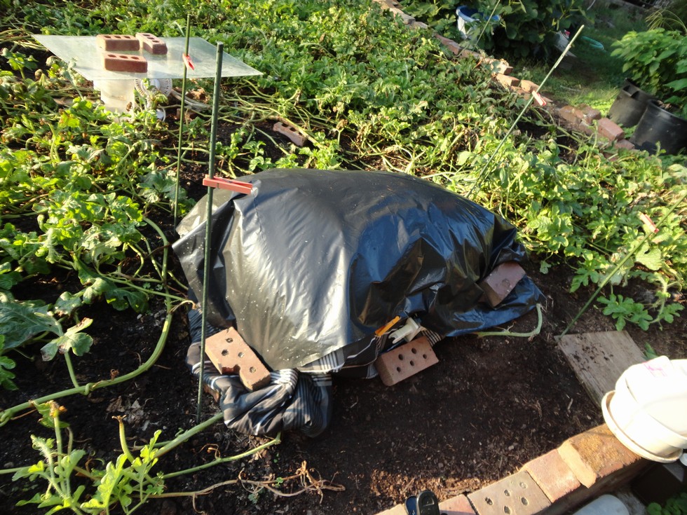 270 Neptune put to bed for the night. It seems to be growing a little again as I measured it at 192" or 197 pounds this evening. Do they ever almost stop gaining weight and then start back a little. Anyway I had a terrible aphid infestation that nearly stopped all growth. I used imidicloprid on the plant and got them killed but lost most of the healthy leaves on the plant. The melon seemed to have almost no growth for 2 weeks or so and now seems to be picking up a little bit. There are a lot of new vines growing and leaves growing now.