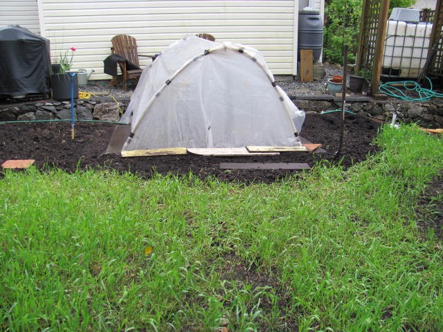Lower patch with slightly larger hoophouse with bigger heat lamp (175 Watt Infared heat bulb) and it keeps the overnight temps around a nice 60-65 degrees when the overnight is 40-55.