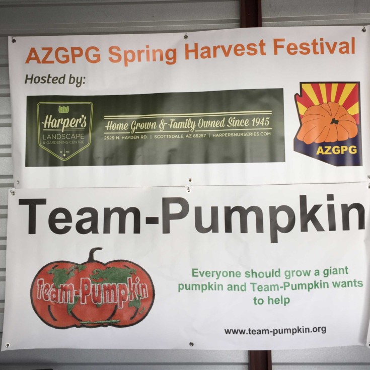 The banners arrived for the weigh-off on May 30. Ribbons have been ordered. Now all we have to do is keep the pumpkins growing so we can beat the old Arizona record. My 1666 Holland was about 360 pounds on Friday. It's growing 10-12 pounds per day. At that rate I might have about a 5% wiggle factor to beat the record.