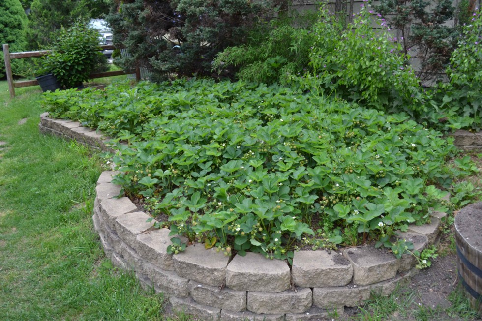 Strawberries just starting to turn ripe. The kids eat them as fast as they pick them.
