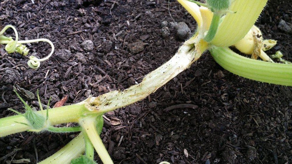 A perfect example of why I have squirrel protection around my giant pumpkin. This is from one of my jack-o-lantern vines. The little bugger loves to get in there and shred the vines. I have tried everything from sonic pest control to critter sprays. It's a real nuisance. My neighbor has vowed to rid it from this earth as it shredded all of his beans and corn. I won't be sad if he's successful.