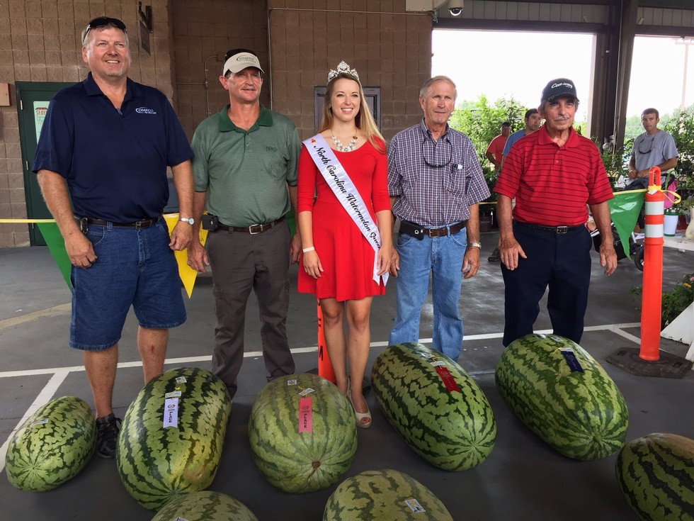 Here is how the NC Farmers Market Watermelon weigh in turned out today. Gentleman on far right won 1st place with 180lbs, to his left is Mr HC with 2nd place of 178.5lbs, continuing left is Robert Worley with 4th place at 135 lbs. Mine is last to the right for 3rd place with 158lbs.