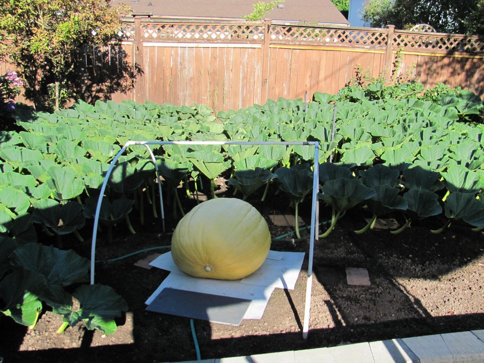 So, Andrea's 1126 Dixon pumpkin at day 26, still a nice long football fruit. She's finally getting around to putting up her rain/weather cover because we are going to be away for 4 days on Vancouver Island.