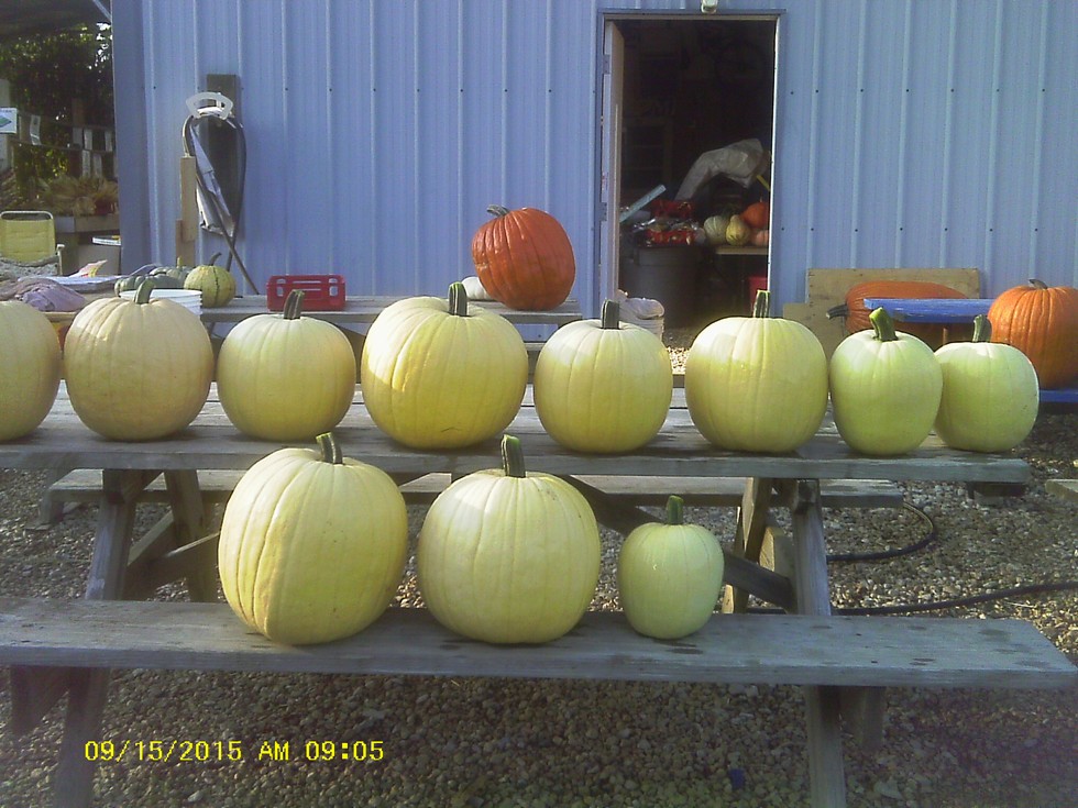 The white sheep of the family. 240 lbs of progeny from what was supposed to be my orange big field producer ( 106.9 House 14. I am not complaining as I put all but the two selfed ones ( two biggest on the seat) on the shelves and they all sold by the end of the day. Hoping the selfed seeds produce white for me next year. I have a 106.9 House in my commercial field that produced a 75 pound orange. not sure what happened but I hope I can reproduce it.