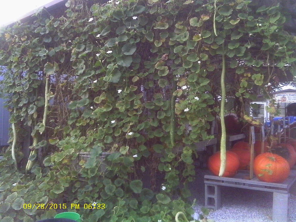 Tried long gourds growing on the end of one of the pumpkin sheds this year. People love them but keep asking if they are green beans. lol