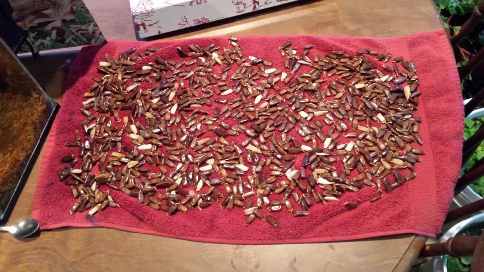 My 213 Bushel gourd seeds. I was going to let the gourd dry to add to my collection, but the cracks in it said otherwise. It started to go bad so I got the seeds out before they were lost. Nice seed count .