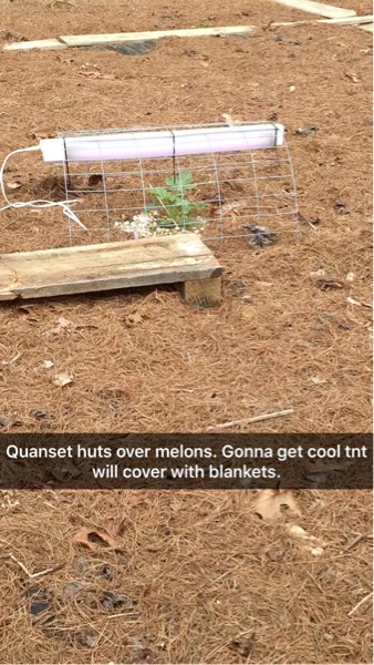 Cool and gloomy today. Put some wire over the melons so I can cover them with blankets later.