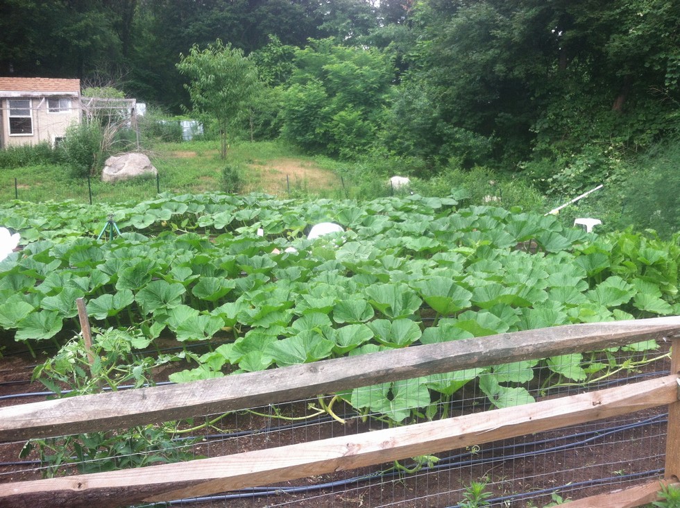 The Lariviere plant is my biggest plant. It starts right in front of the pumpkin that's covered. My problem is that there are 4 pumpkins pollinated on it. 3 of them are the same size pollinated on different days. I accidently snapped the tip off the main about 6 feet after the pumpkin I want to keep. There is a secondary that is taking over for the main. I'm going to wait a week more before I choose which one to go with.