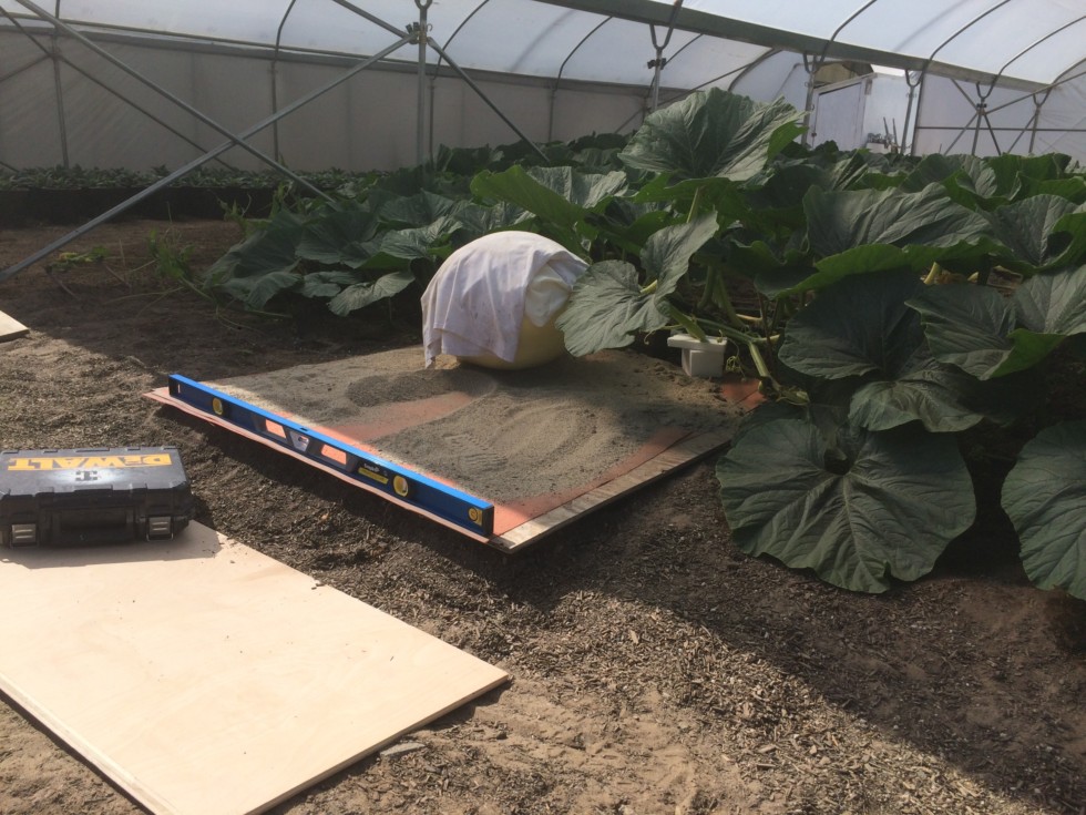 Well,,,, I think I have 2 pumpkins in for the long haul. I've placed both up on the plywood and mill fabric. This is the 1756 at the very end of the tunnel. I had to brace up the plywood with 2X4's under the front in hopes of her growing to the end of her platform. It's not fun or easy to try and do this once the pumpkin is to heavy to slide. I'll posts fruit pictures once I hit day 20.