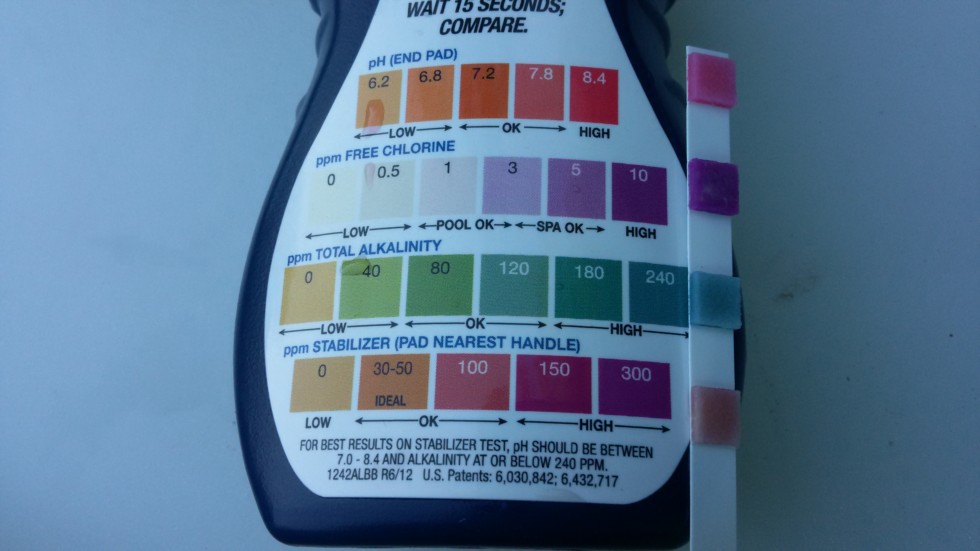 These are the test strips I have mentioned in a couple of posts. These test ph, chlorine, alkalinity, and something else thar is for pools. 10 bucks at the hardware store. This is a sample from our watering tanks. 1/3 cup of chlorine was added to the tanks 2 days ago for disinfection. The tanks will be emptied and rinsed. Or ph was higher than expected and is alkalinity after testing water from one of our faucets.