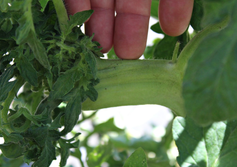 Since I am only showing plant parts instead of an actual tomato might of well throw this in. Check out this side vine from the 7.10 Foss. I went to pick it early on and I think it bit me! That's inbreeding for you. There is a mangle of leaves and stems at the end right now, looking for that mega. I don't think an OBGYN can find a flower in there at this point. Only time will tell.