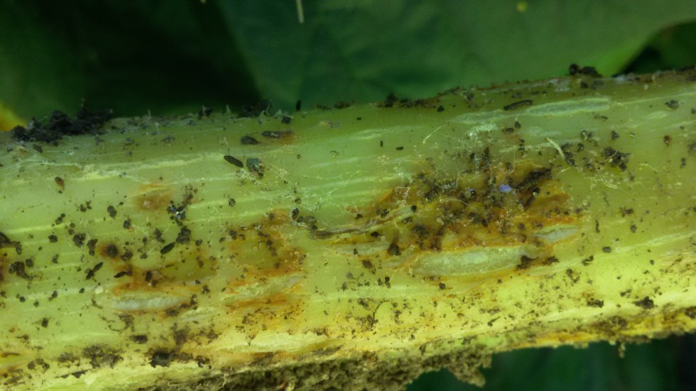 I don't know if you can see it, but there were 2 grubs on the bottom side of the vine. I believe they may be fungus gnat grubs. They will bore into vines just like svb and eventual cause the vine to rot. Heavy Merit drench time.