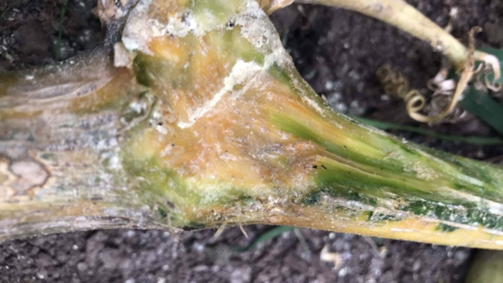 Here is the infection on my 1223.5 gansert plant. It was dried up 2 days ago with sulfur and now it is back to sapping. This is 3 feet before the pumpkin on the main vine. Is this surface rot? It's getting more brown. It smells like rot. My email is [email protected]