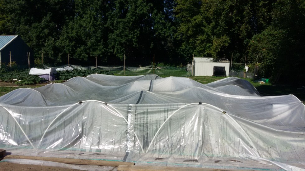 I must be completely nuts, changed over from giant blue tarp to plastic, just to get a few more hours of sunlight for the plant. I am working nite shift (4:30 to 3:00 a.m.) so I have to cover while the plant is in full sun. Than be out in the patch before 10:00 a.m. to take it off. They are calling for temps at night in the low 50's for at least the next 10 days. Also added dehumidifier to hopefully keep moisture levels down, so p.m. don't kill us. Praying to the pumpkin gods to make night time temps go up, so I don't have to do this for the next 50 days. After all this I'm really hoping for a p.b.