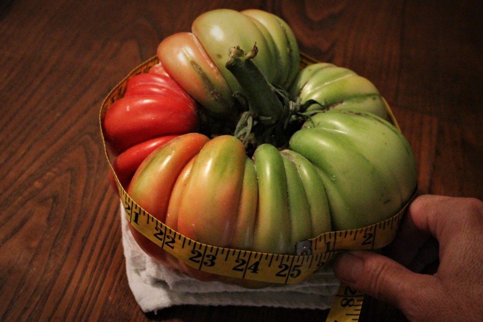 MegaMutt D. It measured 25x 21x 20x .00055= 5.775 lbs! According to the tomato measurement/weights assistant. Well, it weighed only 4.41 lbs. I call it the Domingo complex. Beautiful plant, super blooms, awesome fruit..small weight. I was hoping to break 5 lbs with this one. Too many ripples, empty spaces, and saucer shaped. If it were a solid round it may of weighed that much. I will grow it again.
