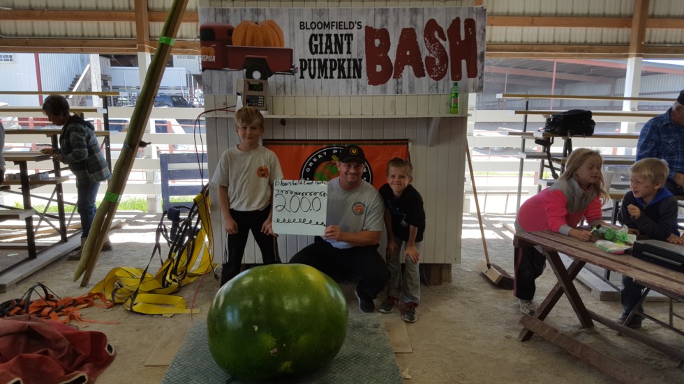 Caleb Jacobus with the 1st place Bushel Gourd at 200 lbs, Bloomfield Giant Pumpkin Bash.