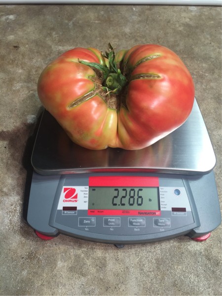 Today is the day. Trying to guess if tomatoes weigh more in the morning or evening. I decided to pick them when I woke up. First off the vine was this one. Weighed 2.29 pounds, measures 19.5 x 17.75 x 14 for an mFactor of .00047. Right about my normal.