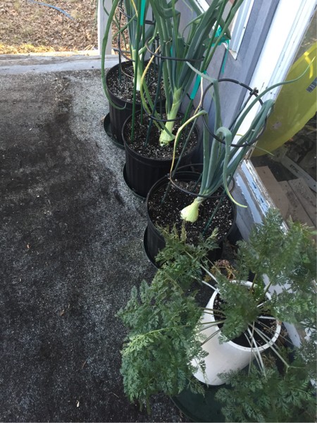 Saving electricity, my carrot and 3 onions are going to spend their first night in the great outdoors. Sometime this week hope to find time to transpant the carrot into a 55 gallon drum and the onions into 40 gallon pots.