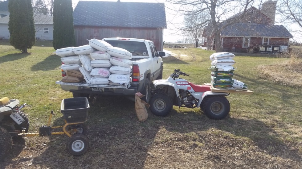 Here we go, got the ferts down, we got 650lbs of an enhanced cow manure matrix with micronutrients, 150lbs of composted chicken manure crumbles, 100lbs of 0-0-50, 10lbs of k mag, 1.5lbs of zinc sulfate, 120lbs of alfalfa pellets, 100 lbs of corn meal and 100lbs of dry molasses.
