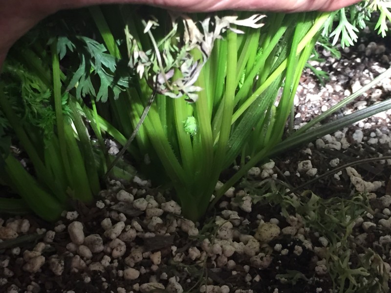 The base of the indoor carrot. Looking at the way the bottom of the foliage is developing I am quite sure this carrot has forked multiple times. Heavy organic feeding..running a nutrient ratio that reduces to about 1-1-2 . I think I need to mix up another super compost tea brew. Not going to tell you..it is my secret sauce.