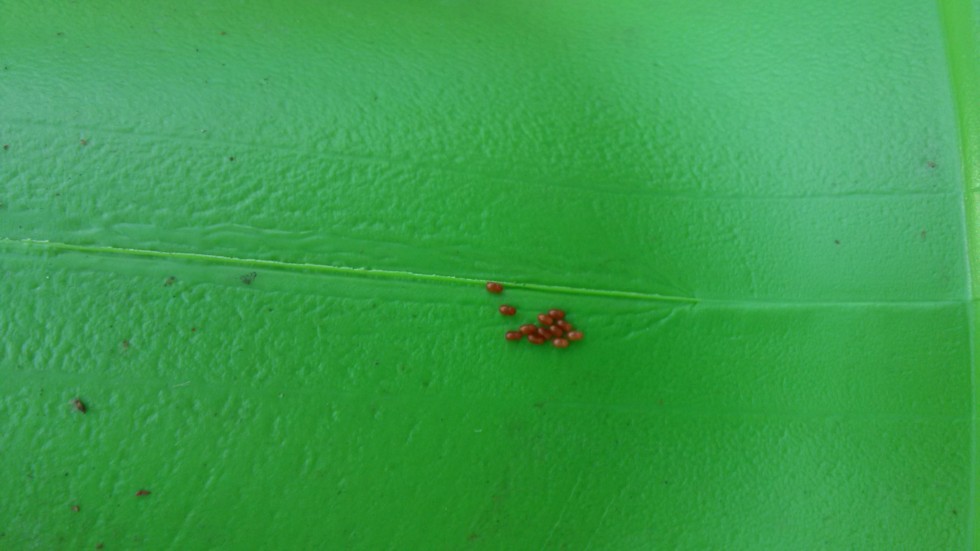 I'm guessing these may be from a marmorated stink bug, kinda early for squash bugs. They aren't very smart because the eggs were on my green watering can that I bought 2 weeks ago. Must have thought it was a leaf.
