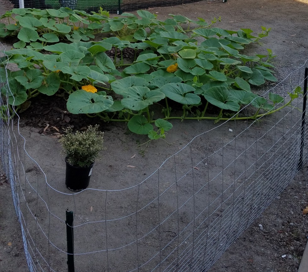 Look at our plants go! I gave them more room and they're obviously taking full advantage of it. We recently bought the potted plant you see in the picture to attract bees. So far it hasn't helped at all. I think tomorrow we'll do some trimming to eliminate some of the leaves that are yellow or look like they're taking up valuable energy.