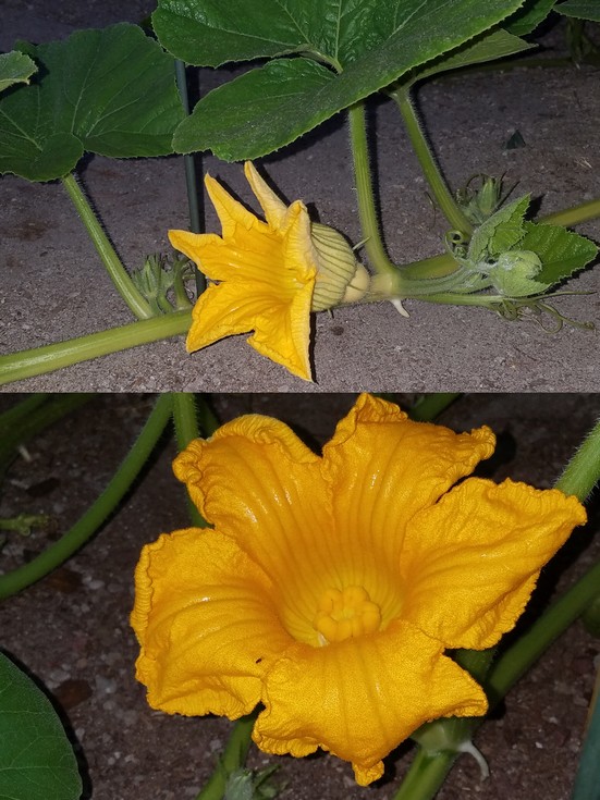 I just want to say thanks to the members who told me we were going to have bloomers. They bloomed and it was pretty amazing. Here they are and I am quite sure these two pumpkins are going to be big ones. We'll see in time though, because now I know the fun is really starting. :>]