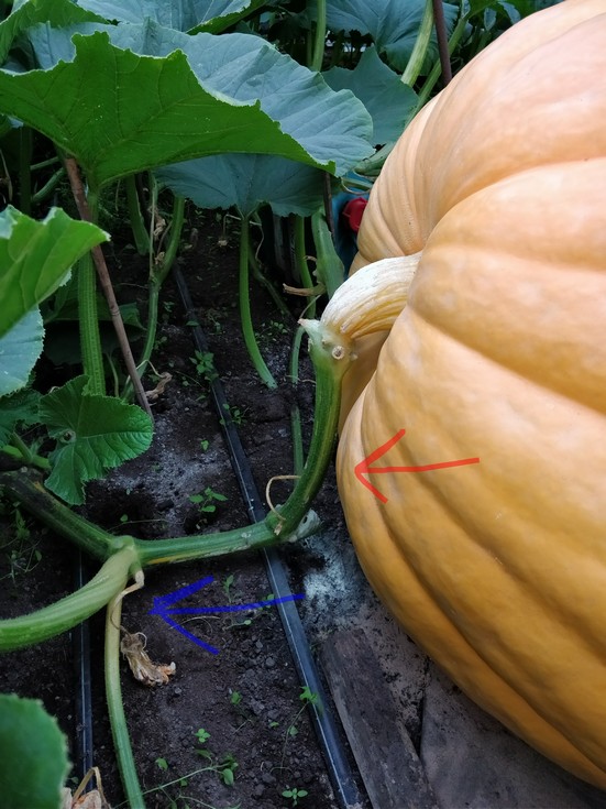 Problem with 874.8 stem. Vine can not move out of the way quick enough in the direction of the blue arrow. Pumpkin is growing fast in direction of red arrow and threatens to pull itself of the vine.