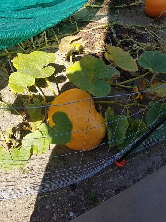 I promised a picture this time, so here all you go. This pumpkin was very small only a few days ago. It has now grown much larger than our "largest" pumpkin which seems to have stopped growing. =/ I really had high hopes, however I'm sure the powdery mildew attack didn't help it at all. However, I think we have finally got a handle on it after 'kingoffarmerz' recommended we try "Bonide" Copper Fungicide. I drenched every living leaf with it and I think it worked. I wish I would have used it from the beginning. I might have been able to save a lot more of our leaves and you'll probably be able to notice the the loss we took from this picture. Big thanks to 'kingoffarmerz' though for that info. and for his recommendation to cut back on the water. =)