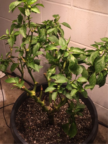 My green pepper plant is almost one year old. I started it last winter had two crops indoors, ignored it outside all summer and had a third crop. Months of not watering really shrunk the plant down. Surprise it is getting new growth low on the plant. With last night low temp of 29 degrees I brought it back inside. Wonder how it will do with a tree trunk for a stem and some good hydro nutrients indoors this winter. Going to start out with keeping only one set for this next round. Maybe I will be over my pb set last winter.