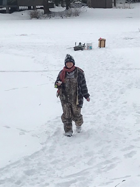 Val and I got out for some ice fishing. Well I stayed in the cabin and watched Val on the ice. No time to slip now.