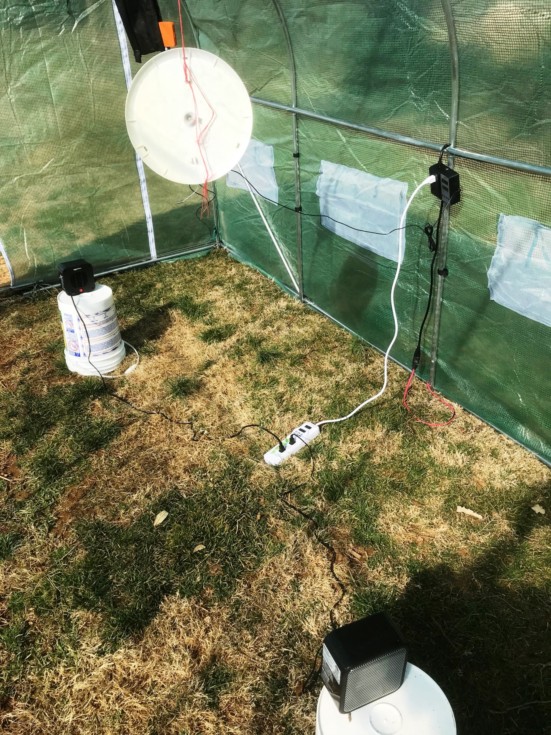 Outfitted with 2 Amazon Basics 500-Watt Ceramic Personal Heaters ($16@)- (I pay 4Cents/KWH) controlled by a Bayite BTC201 Digital Temp Controller $35 (a really neat gadget). The hanging thermometer is inaccurate with the sun on the greenhouse but accurate after sunset. BUT � best of all, is the little orange gadget hanging behind it � An Elitech GSP-6 constant temp/humidity monitor ($40).. It gives graphs of 24hr temp and humidity and cycles over 12 weeks. Shows what really happening overnight - cool