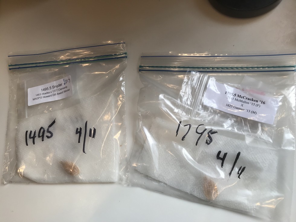 Just couldn�t wait to start 2nd salvo. The famed 1795 McCracken �16 and MAGPA Howard Dill Award winner for most beautiful orange specimen Snyder 1495 �17. In plastic bags with wet paper towel. Other than filed edges, no other special preparation or potions.