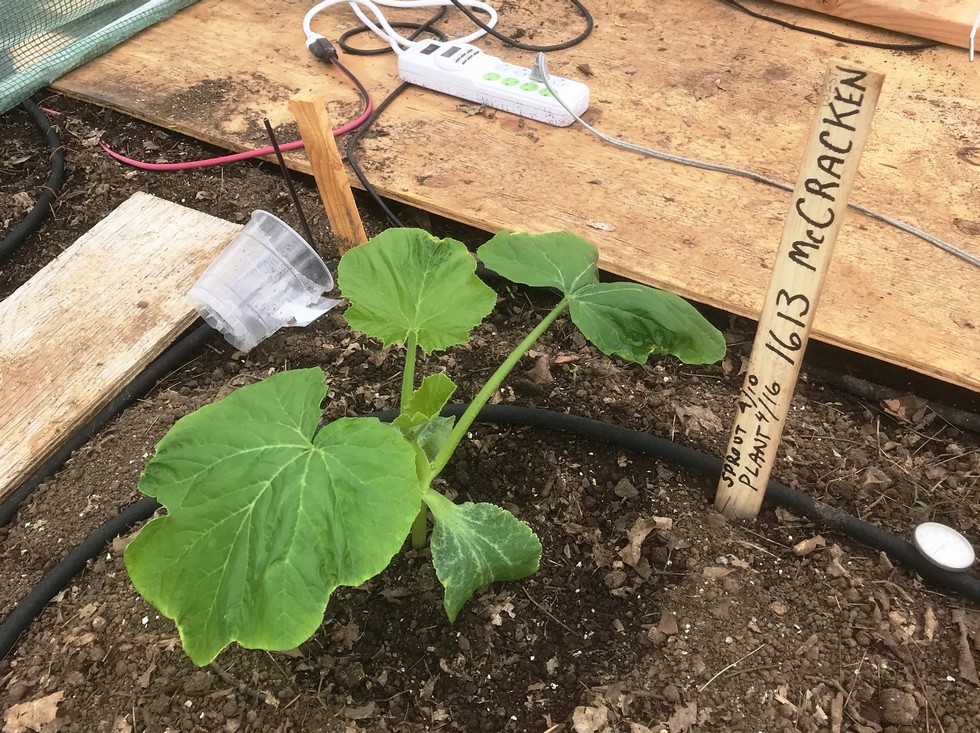 1613 McCracken Day 15 since sprouting; Day 6 since planting. Ground temp 70 with cable on, 62 in area without cable. Temp varying 70 at night to 85-90 during day with thermostatically set heaters and (finally) some sun. Set drip irrigation 20 min every other day.