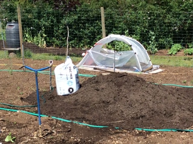 We are stockpiling compost closer to the plants, in preparation for covering and burying vines. We mix the compost with Premier Promix High Porosity Mix with Mycorrhizae. I�d say we use about 4 large bales per yard to get the right consistency. This year a pinch of Gaia Green 4-4-4 might just get added to the mix, when we put it in 5 gallon buckets to use.
