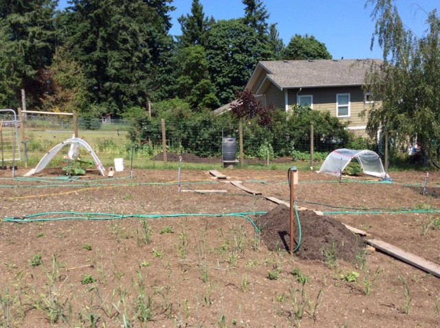Front and rear plastic ends off the hoops now as the plants reach out for more ground. 2255 Eddy Z on the left and one of our 1043 Chan plants on the right. The other Chan plant has the entire upper patch to itself and I might see if I can get 2 pumpkins to set on it. Need to do a little weeding, test watering system and put out some more walking boards.