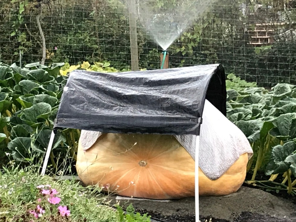 Getting a nice drink of water with 200 ppm kelp and 350 ppm of Growth Products 0-0-25. Pumpkin continues to outgrow its sun/rain cover, and tapes 1250 lbs today. We�ve never had a pumpkin this large at the end of August, so we are gonna do our best to keep it growing for another 6 weeks till we take it to Weighoff.
