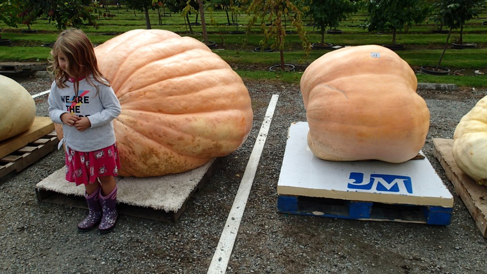 My smaller kin is the right. Joel Holland's larger pumpkin on the left is the one all the kids were posing in front of and climbing on, sorry Joel.