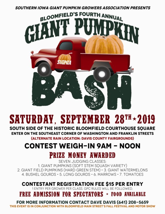 The Bloomfield Giant Pumpkin Bash will be held at the Davis County Fairgrounds due to rain forecasted. It's at 20471 Old Hwy 2 Bloomfield, Iowa 52537. Call if you have ?'s. (641) 208-5659. It will be held in a huge building for shelter. Info on Message Board (General Discussion)