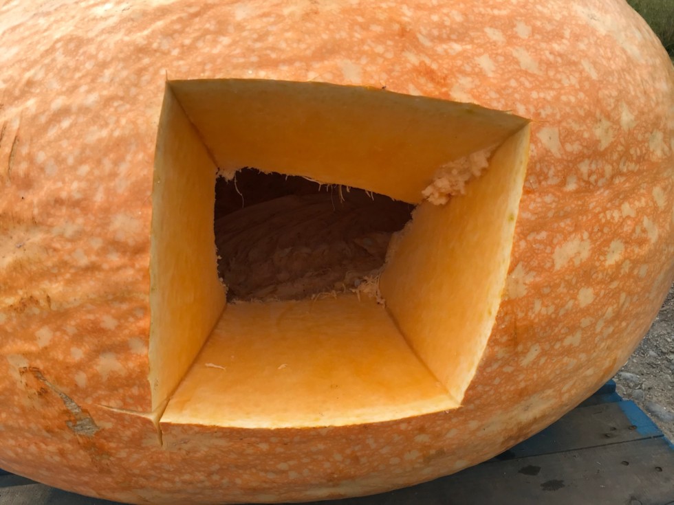 Solid as a rock and as thick fleshed a pumpkin as we have ever grown. The 1116 lb Dixon (grown from 1043 Chan) sits awaiting its destiny, but I harvested some seeds before the deal was done.