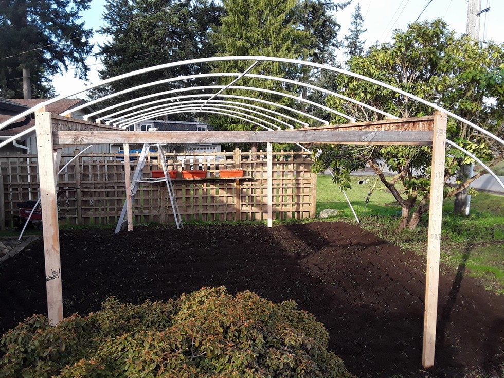 I got the center section of the greenhouse frame finished. I will finish off the sides and add the plastic after the soil is amended. I also did the first till on the patch and sent in Soil Samples. The Puyallup Fair Weighoff is on September 4th. It seems like in the past I have always been taking 60-70 day old pumpkins with growth left in them so this year I am starting Early. I am going to germinate on March 1st.