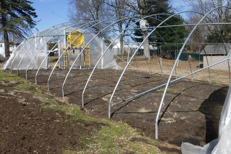Amendments are spread, hoops are up, purlin braces in place and fans are installed so the amount of walking in the growing space is now reduced. At this point tilling can take place.