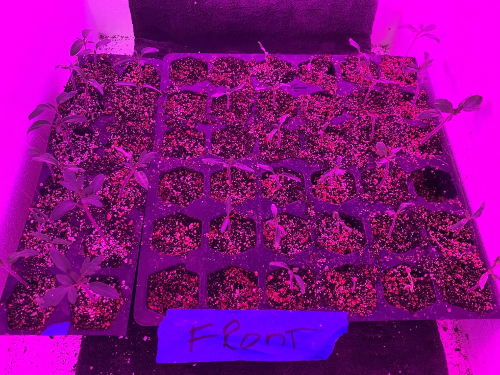 Competition tomato seeds coming along at 14 days. Third row from the left is a mostly no show 5.71 Lambchop. Not to worry. Three came up in the other tray. Far left 7.64 Spaziani that I started several days later than the others. 2nd row, some nice looking 9.65's. Far right two rows 6.66's. All the other rows everything in between.