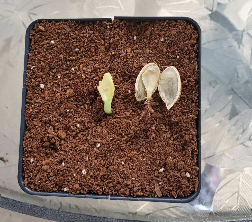 This was a 1st for me. 955 Clementz green squash was stuck in the shell. I noticed another root sticking out the side of the seed. I removed the seed, opened it up and there is another seedling inside. Twins! I planted it to see if it will grow too.