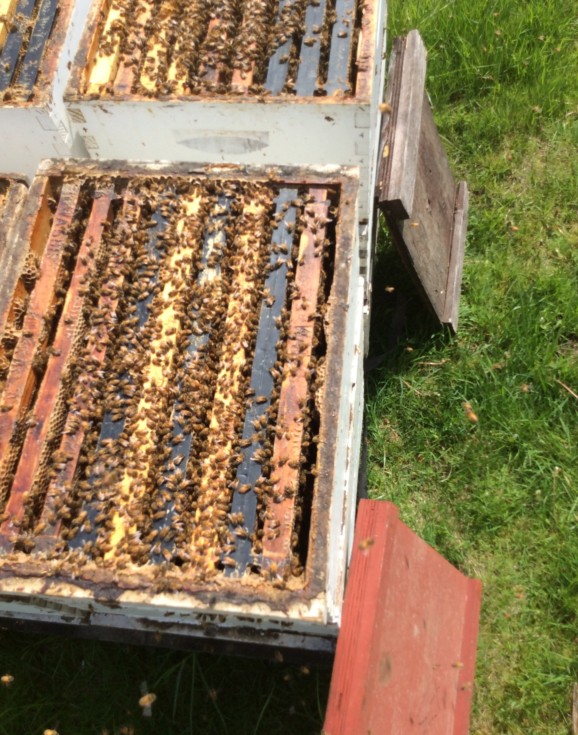 Beehive gain 4.5 lb this week... but a cover blew off and it got rain on the wood. Probably a pound or two was just water soaking the dry wood. Checking inside... Not much honey. The only thing they are really gaining is brood (the unhatched baby bees). This pic is not the same hive but it's similar...