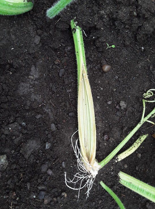 What a revoltant development this is. Found this massive split on the main vine of the 2152 today. I am not sure what this means for the prognosis of the future pumpkin. I believe that the nutrients travel in the tissue parallel to the vine. The center of the vine is just a hollow tube and not crucial to the plant. all of that is still connected so theoretically as long as I keep it clean and free of disease I should be okay. on the plus side look at all of the great root growth out of the top of the vine on that node right at the end of the split. Looks like my new additions to my vine burying strategy are working.